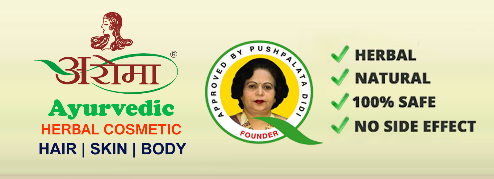Aroma Herbal, Pure Ayurvedic/Herbal cosmetic for Hair Care, Skin Care and Complete Body Care. All Product is Approved by Late Pushpalata Tidke were Known as Pushpalata Didi, prepared according to the traditionally established formulations taught by India’s great rishis years back.